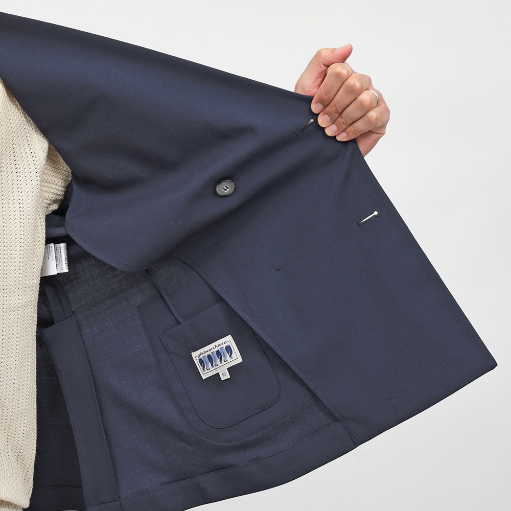 ダブルブレストのモデル“PALAGIO(パラジオ)”。今シーズンはコレクションに入っていなかったモデルですが、ringだけで限定復活しました。人気のシングルジャケット同様に、アンコン仕立てで裏地も無く、袖は筒袖仕上げ。あくまでも気軽に羽織れるシャツジャケットの仕上がりとなっています。また、通常のスペックよりも着丈を少し短くすることでバランスを整えた別注仕様です。