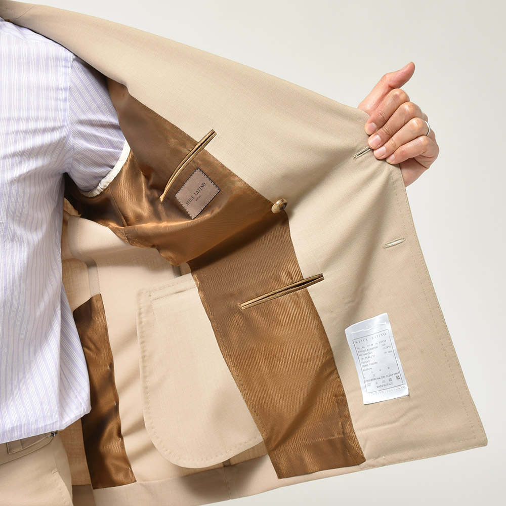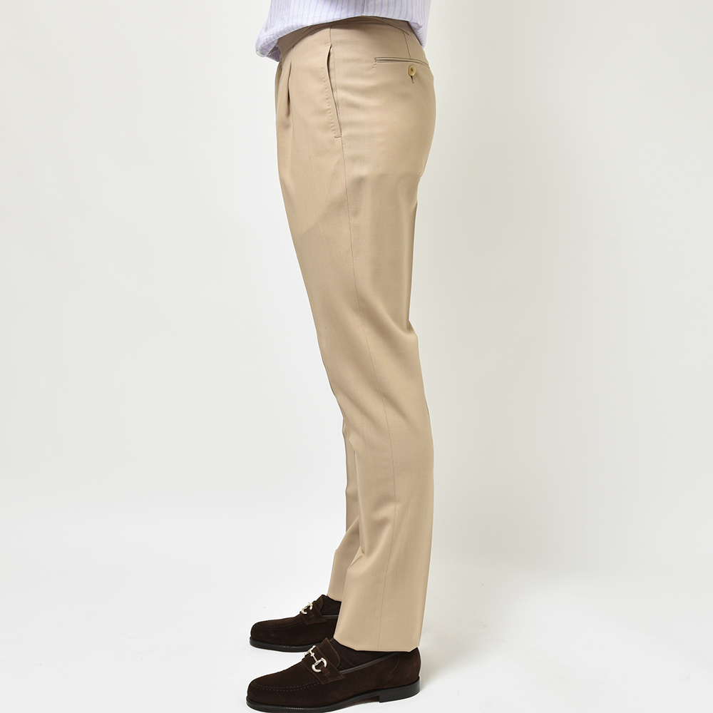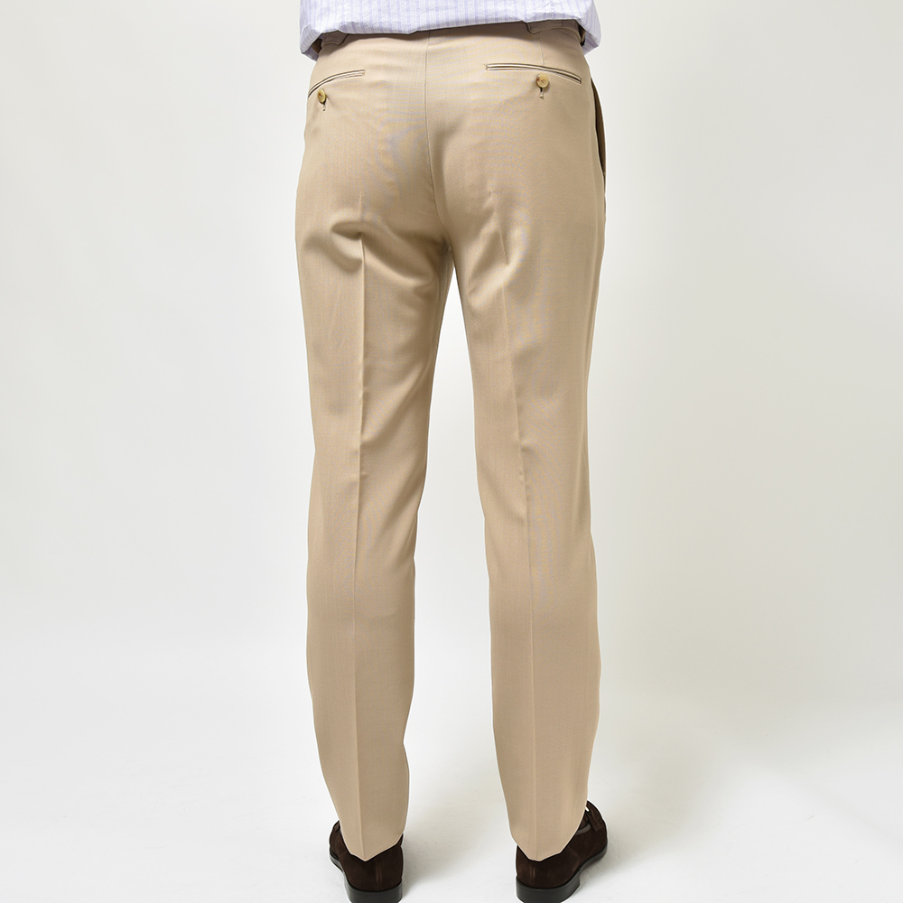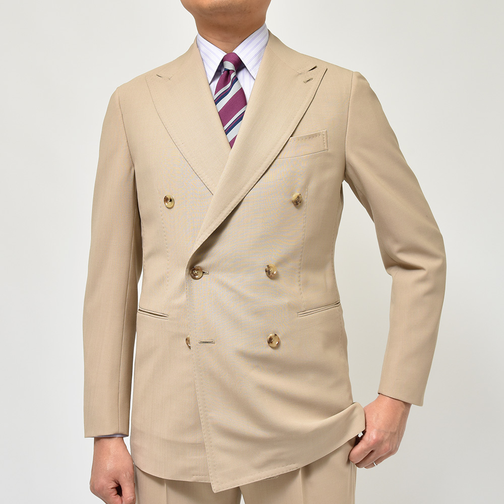 サイズ48がジャストサイズです。ジャケットはタイトすぎず、緩すぎずちょうどいいサイジングです。それでいてスッキリとしています。パンツは股上が気持ち深く、裾にかけて緩やかにテーパードしたクラシックな印象です。清涼感漂うベージュのウールフレスコスーツです!