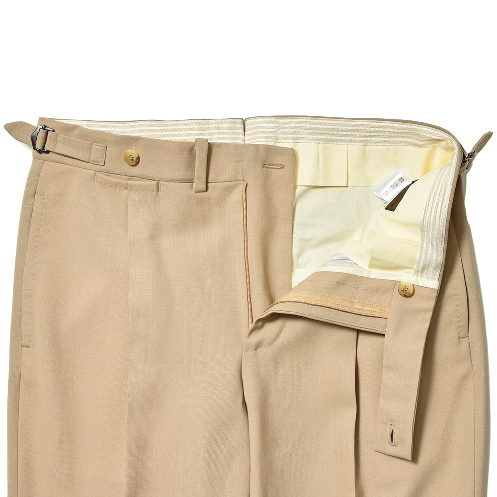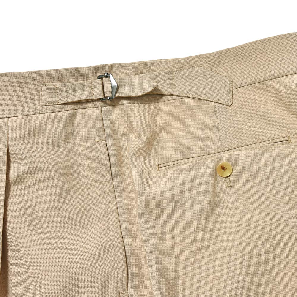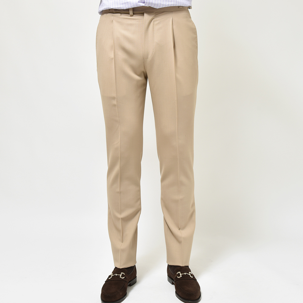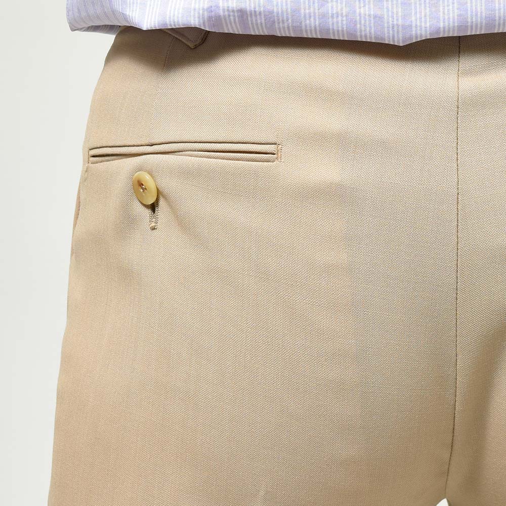 サイズ48がジャストサイズです。ジャケットはタイトすぎず、緩すぎずちょうどいいサイジングです。それでいてスッキリとしています。パンツは股上が気持ち深く、裾にかけて緩やかにテーパードしたクラシックな印象です。清涼感漂うベージュのウールフレスコスーツです!