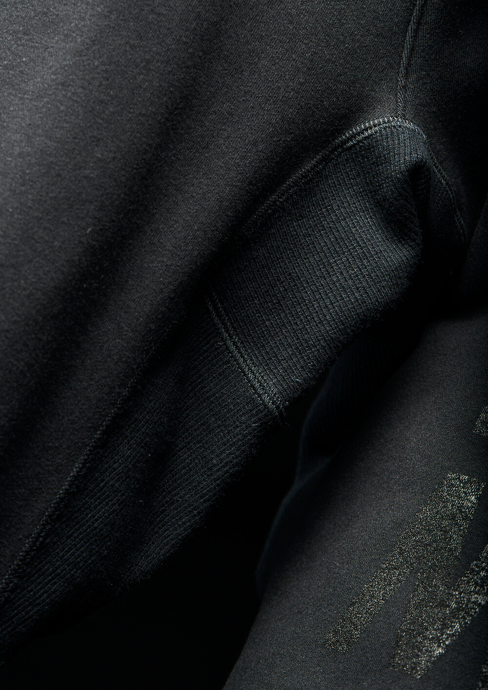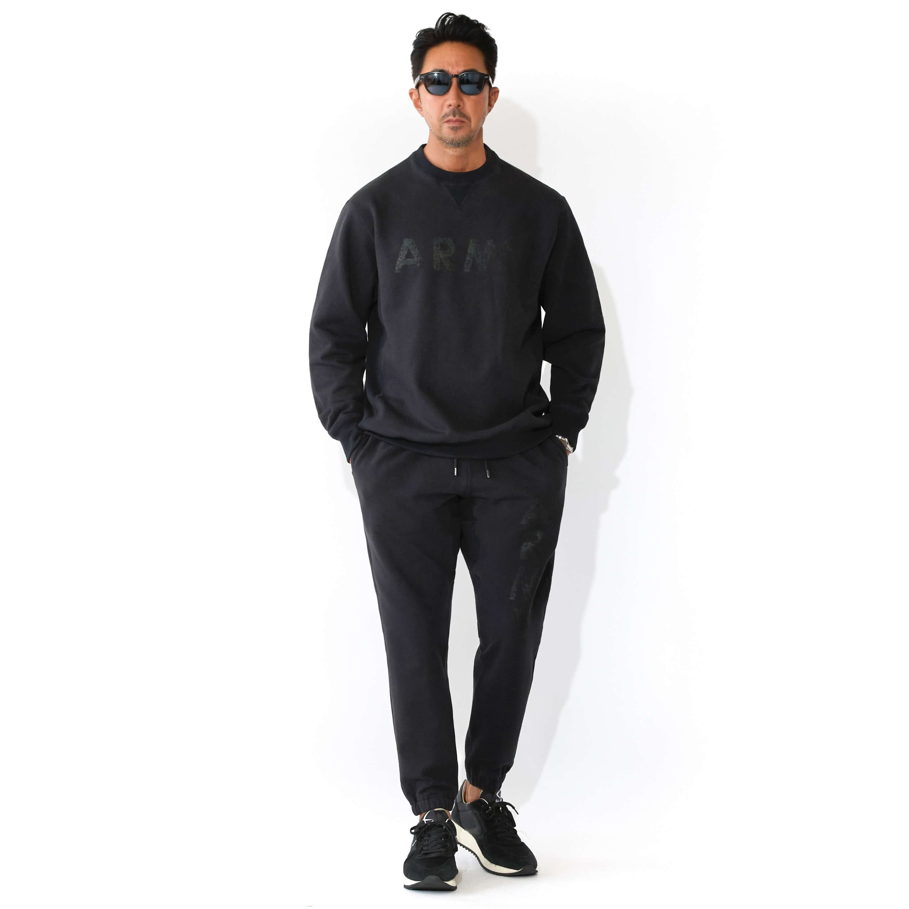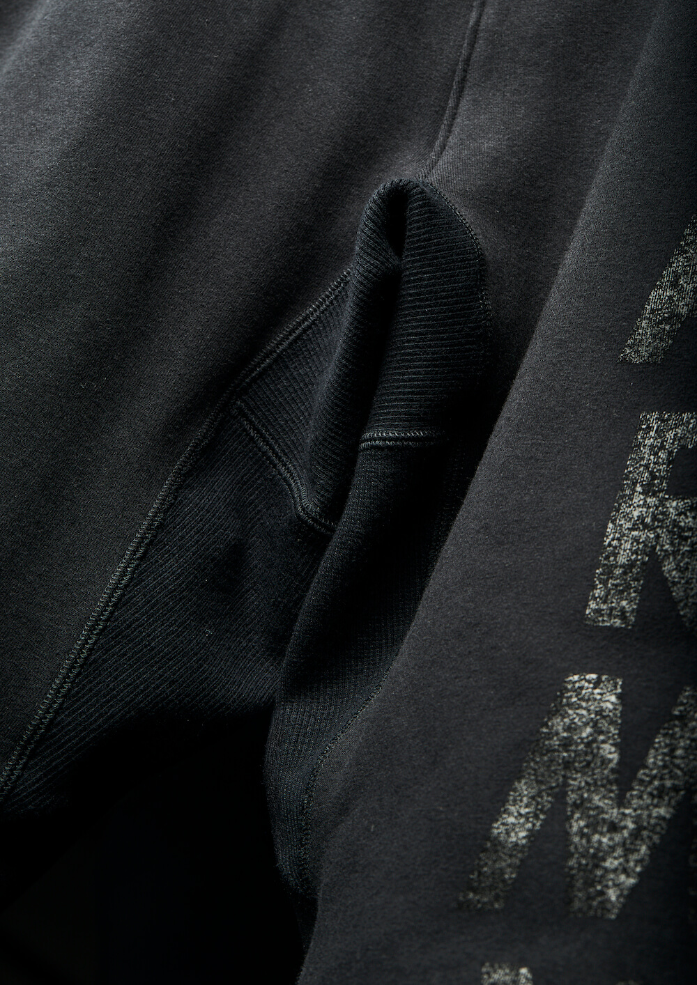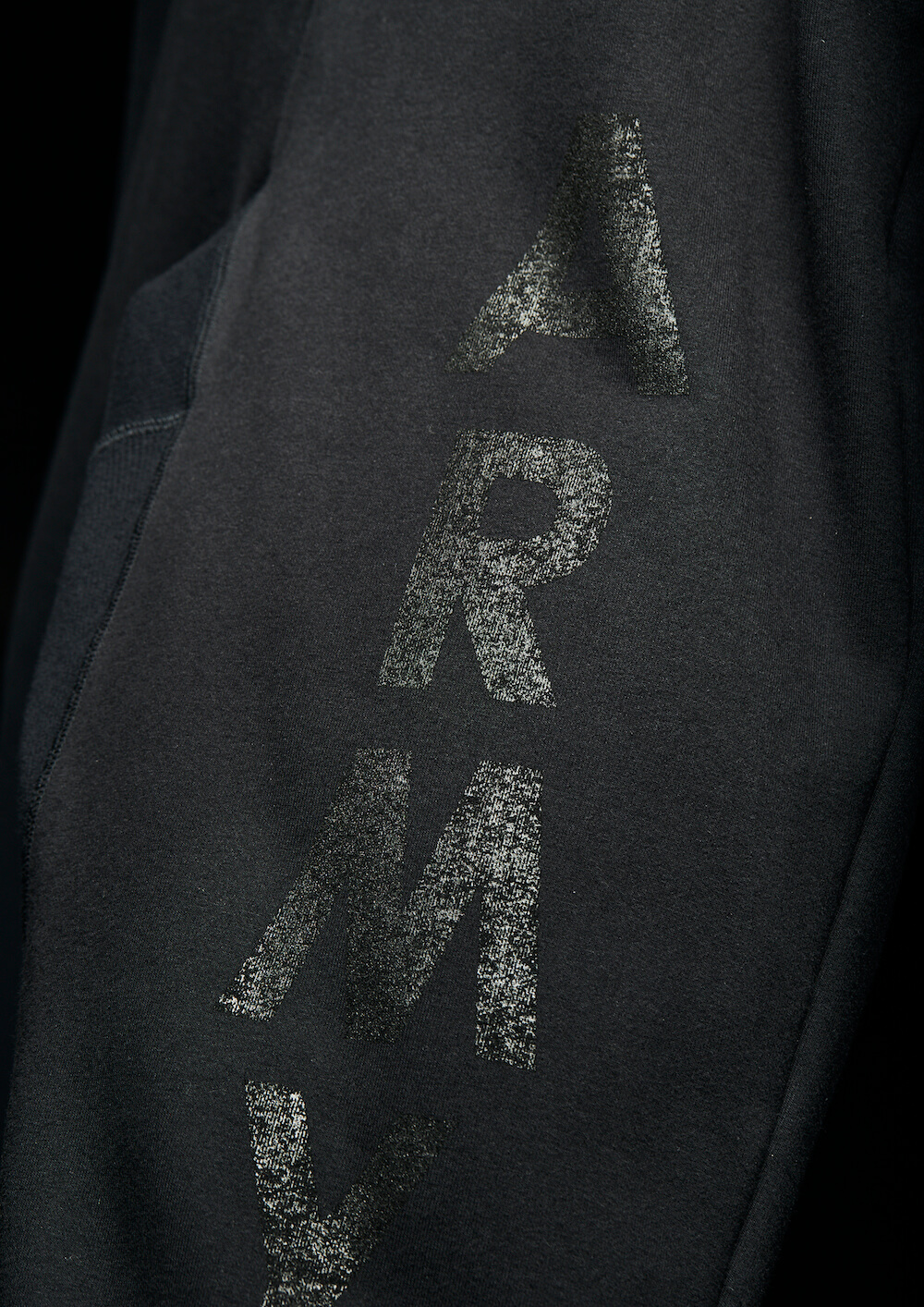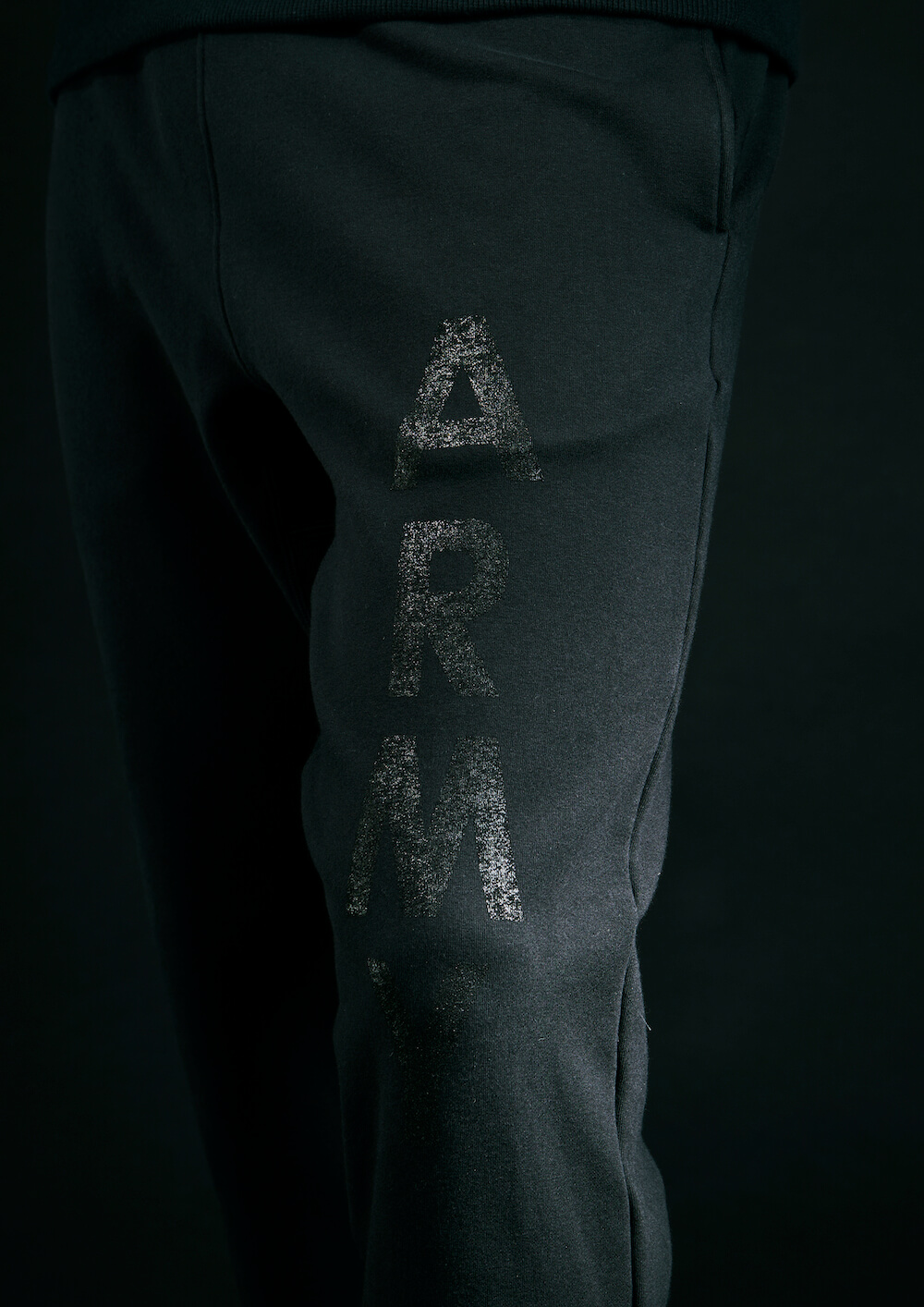 本来杢グレーの商品ラインナップですが、今回黒のみで黒地に黒でプリントを施し、上質なミリタリースエット ジャージとして、ZIP パーカー、R-NECK スエット、ジャージパンツの 3 点でリリース致します。