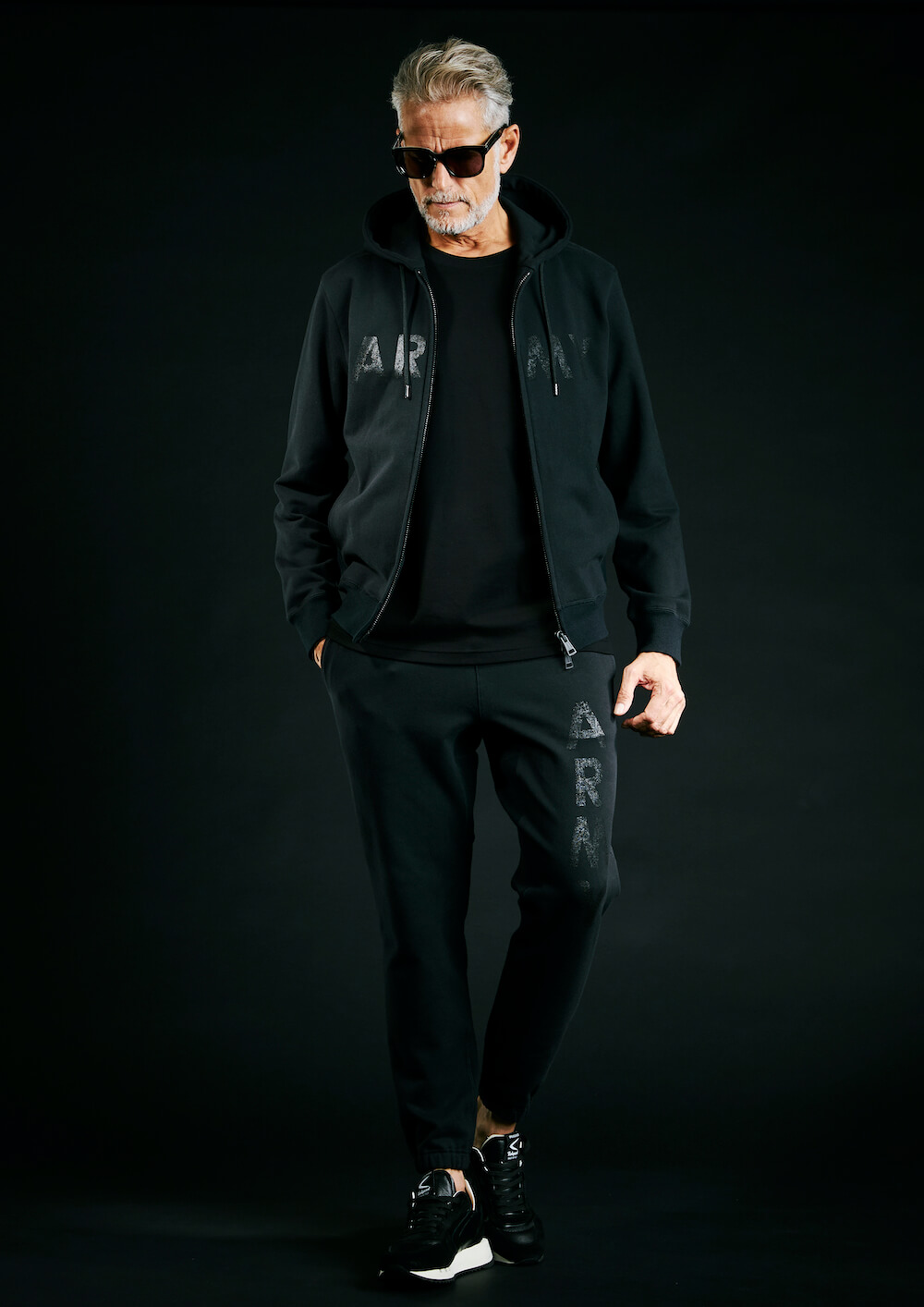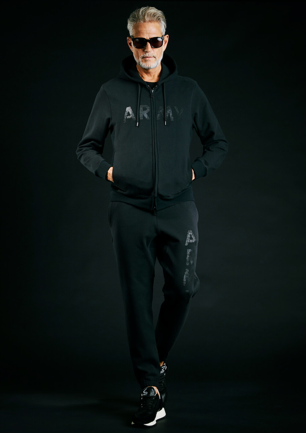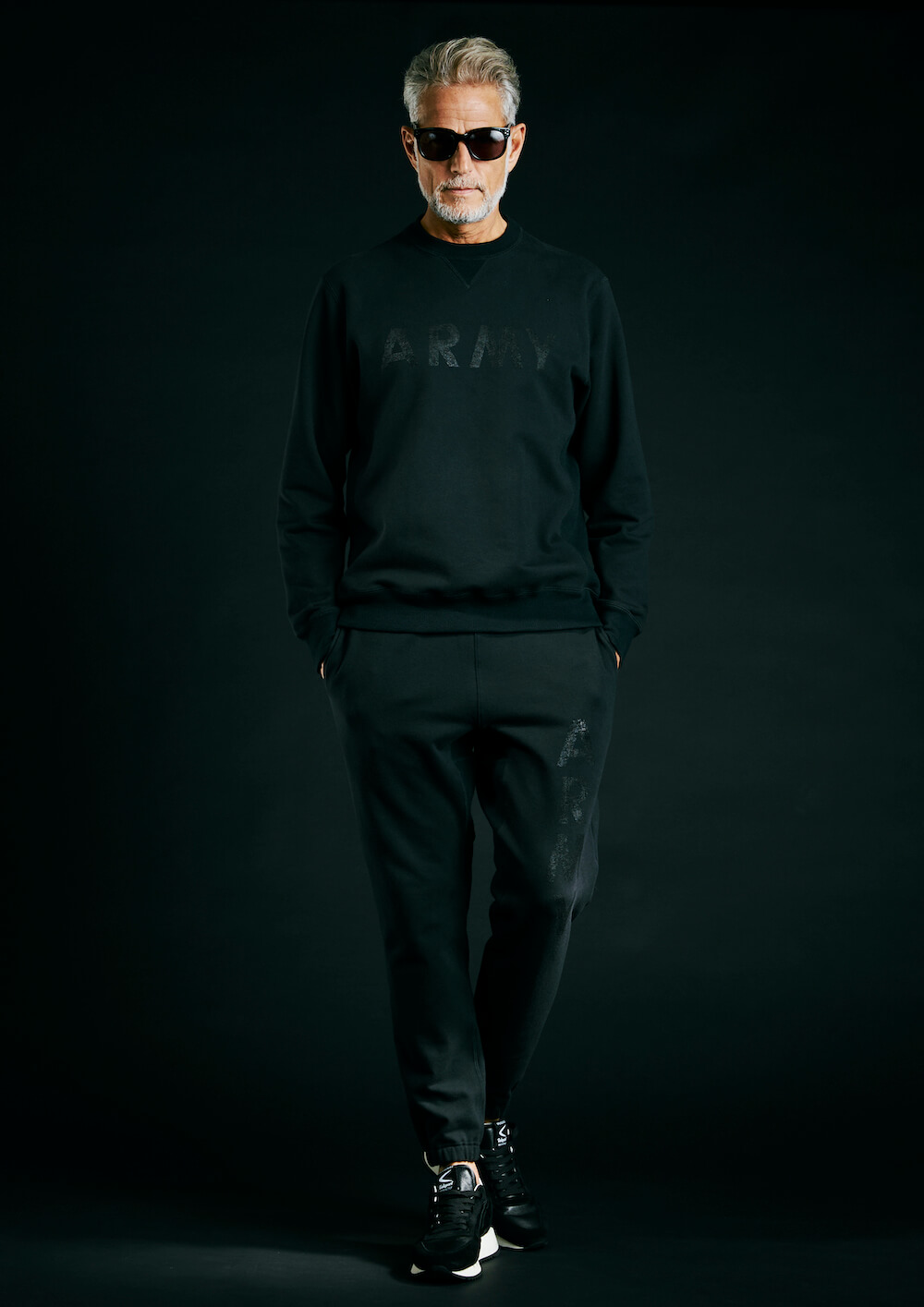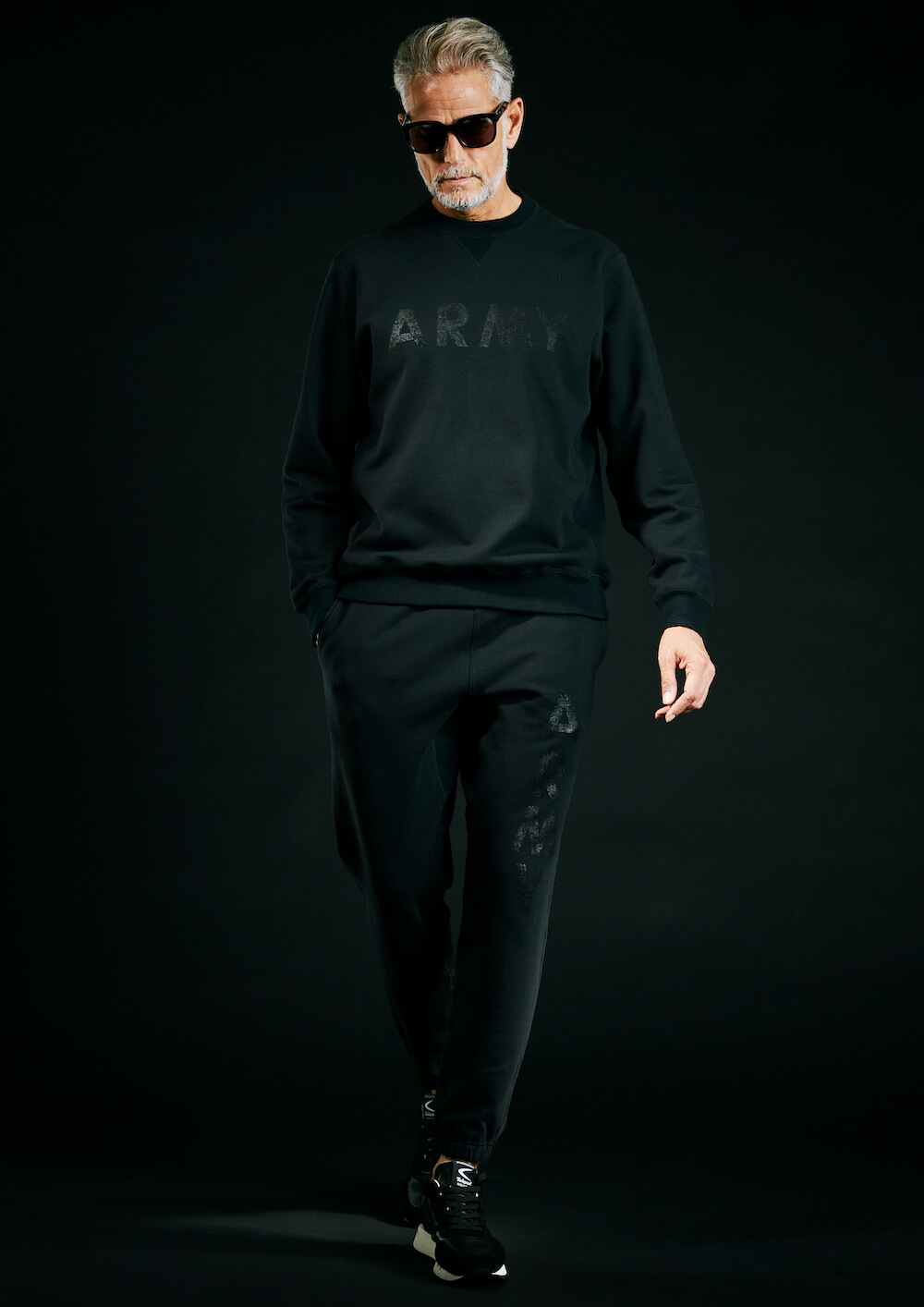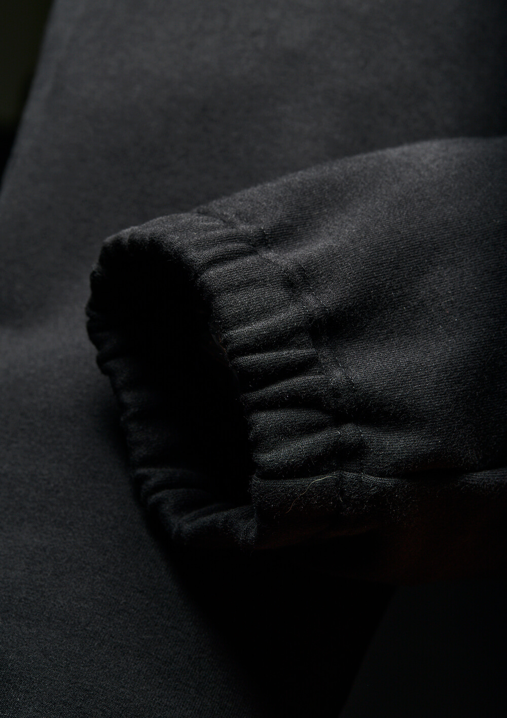 本来杢グレーの商品ラインナップですが、今回黒のみで黒地に黒でプリントを施し、上質なミリタリースエット ジャージとして、ZIP パーカー、R-NECK スエット、ジャージパンツの 3 点でリリース致します。