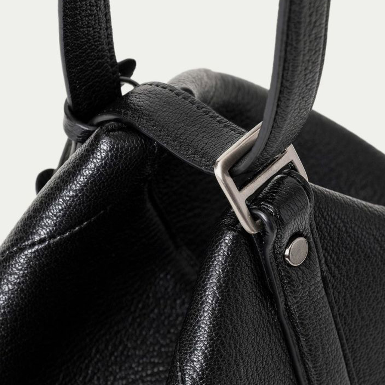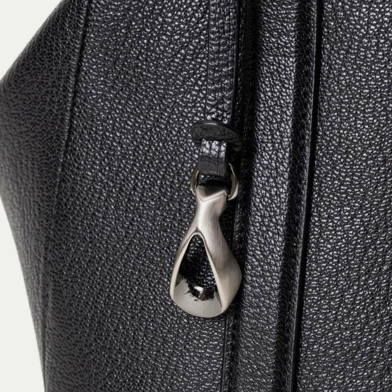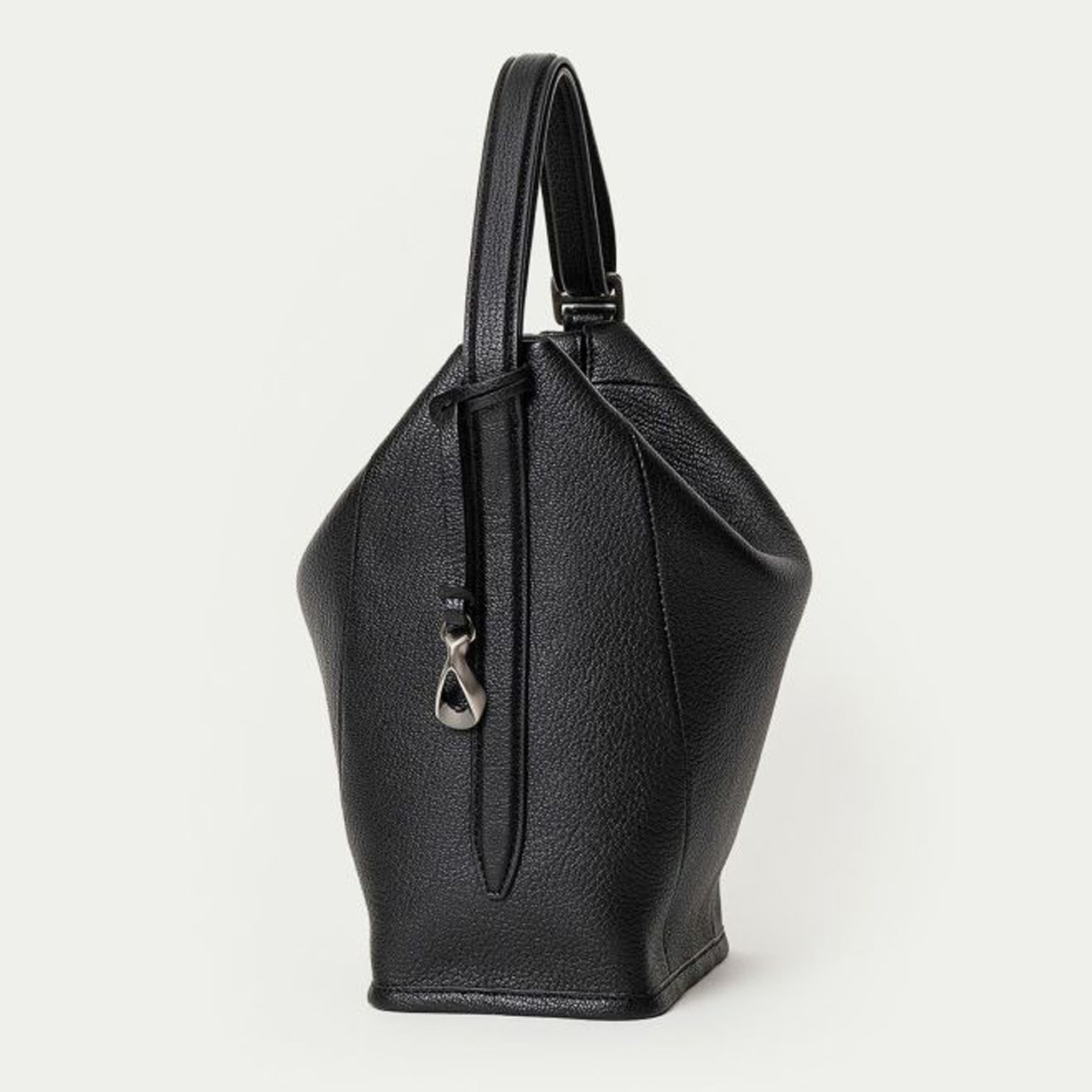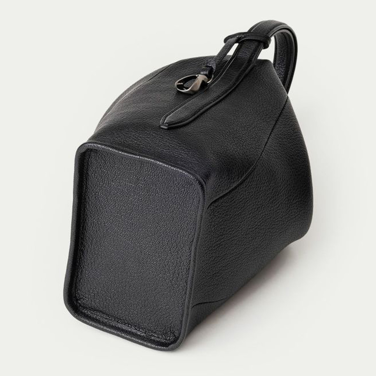 ハンドルの接続部や逆サイドのチャームには、オリジナルの真鍮金具を使用。ブラックニッケルにシルバーヘアラインを施した特別仕様で、エッジの効いたフォルムをさらに印象付けています。