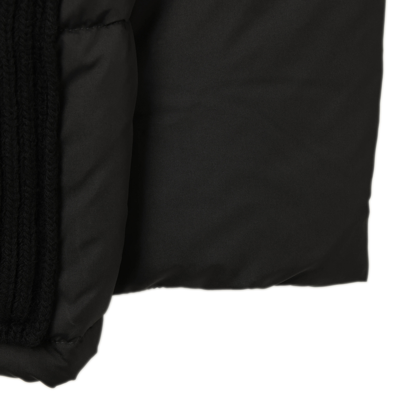 こちらのショート丈のダウンブルゾン。ベースには程よい艶を感じさせるポリエステルの生地を使用し、前立て、ヨーク、フード、ポケットをウールナイロンのニットで切り替え。