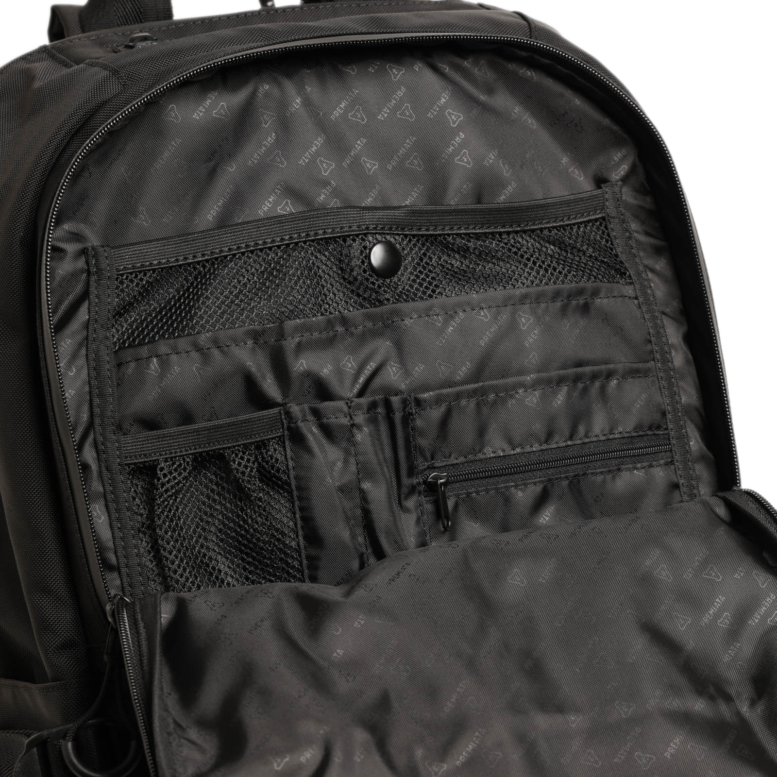 2層式になっており、メッシュ素材を使用したポケットやファスナーポケット、このスペース自体にタブレット等を収納可能な厚みも持たせております。
